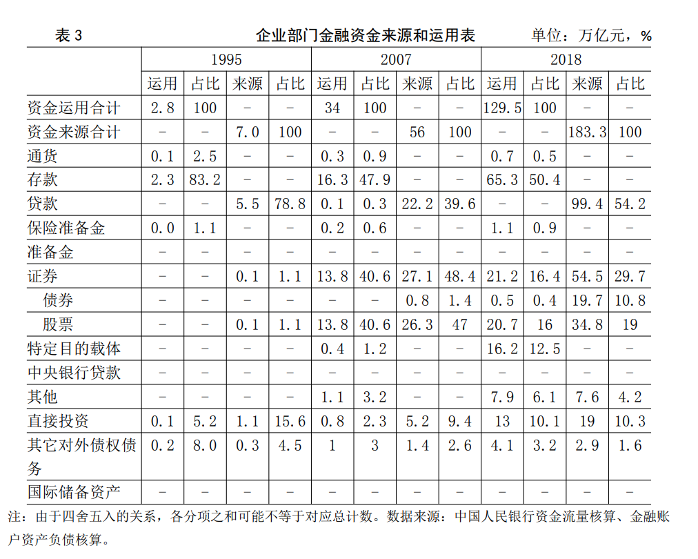 (2)企业部门股票融资占比下降,跨境投融资稳步增长。2018 年末, 企业部门资金运用和来源总额分别达 129.5 万亿元和 183.3 万亿元,较 2007 年末年均增长 12.9%和 11.4%。企业部门是金融资金的最大净融入部 门。从资金来源结构看,贷款仍是企业的主要资金来源,总体呈现较快增 长。随着债券市场的发展,企业部门债券融资快速增长,2008 年至 2018 年间,债券融资占比累计提高了 9.4 个百分点。企业部门股票融资增长放 缓,2018 年末股票市值占比较 2007 年末下降了 28 个百分点。 在金融市场双向开放程度提高的背景下,企业充分利用境内、境外两 个市场、两种资源,跨境投融资规模稳步增长。2018 年末,企业部门国 外金融资产和负债(直接投资和其他对外债权债务项下资金运用和来源) 总额分别达 17.1 万亿元、21.9 万亿元,是 2007 年末的 9.5 倍、3.3 倍(详见表 3)。