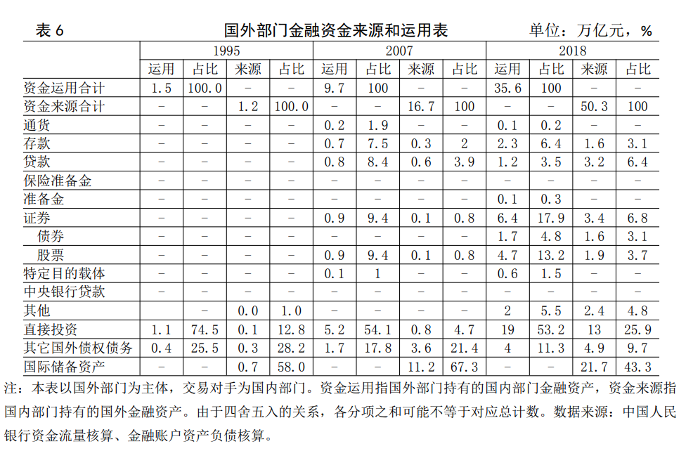 (5)国外部门金融市场投资占比提高。2018 年末,国外部门金融资 金运用和来源总额分别为 35.6 万亿元和 50.3 万亿元,较 2007 年末年均 增长 12.5%和 10.5%。直接投资仍是国外部门的主要资金运用方式,但占 比有所下降。2018 年末,直接投资占资金运用总额的比重为 53.2%,较 2007 年末下降 0.9 个百分点。随着我国金融市场发展和开放程度提升, 国外部门对我国金融市场的投资增多。2018 年末,债券和股票投资占资 金运用总额的比重分别为 4.8%和 13.2%,较 2007 年末上升 4.8 个和 3.8 个百分点(详见表 6)