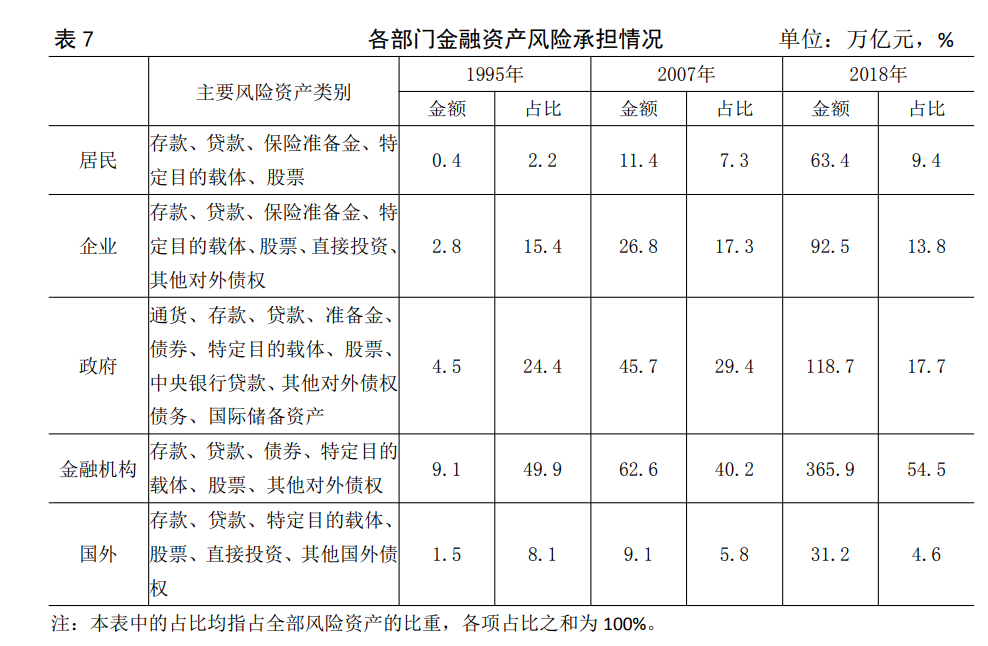 从上述测算的金融资产风险承担情况看,近年来金融资产风险明显向 银行等金融机构集中,而金融机构的风险相当部分最终要由政府承担。 2018 年末,由金融机构和政府部门承担风险的金融资产规模分别为 365.9 万亿元和 118.7 万亿元,是 2007 年末的 5.85 倍和 2.60 倍,占全部金融 风险资产的比重为 54.5%和 17.7%,总计达 72.2%,比 2007 年高 2.6 个百 分点。风险向金融机构集中的趋势明显,2018 年末,金融机构承担风险 的占比较 2007 年末提高了 14.2 个百分点。从其他部门看,2018 年末居民、企业和国外部门承担风险的占比分别为 9.4%、13.8%和 4.6%。