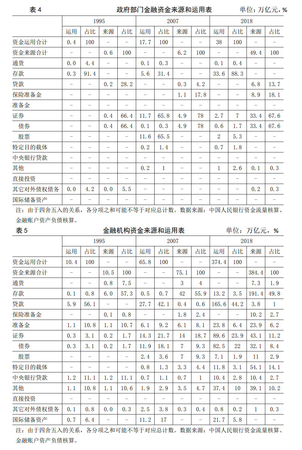 (3)政府部门由金融资金的净供给者变为净需求者。2018 年末,政 府部门金融资金运用和来源总额分别为 38 万亿元和 49.4 万亿元,较 2007 年末年均增长 7.2%和 20.8%,后者增长明显快于前者。政府部门资金运用 和来源之差由 2007 年末的 11.5 万亿元下降至 2018 年末的-11.4 万亿元。 从资金来源看,政府债务和社保收入等增加较快,2018 年末,债券、保 险准备金和贷款余额,分别占政府部门资金来源总额的 67.6%、18.1%和 13.7%,较 2007 年末年均分别增长 19.1%、20.9%和 32.8%。近年来,随着 政府债务管理更趋严格、规范,政府部门贷款余额下降。2018 年末,政 府部门贷款余额较 2016 年末下降了 19%。政府部门对地方平台及一些企 业还有一部分“隐性负债”,基于会计记账原则,不体现在政府部门的金 融资金来源和运用表中。从资金运用看,政府部门持有的股票从 2007 年末的 11.6 万亿元下降到 2018 年末的 2 万亿元,主要是在股权分置改革后, 限售法人股陆续解禁,通过市场出售、转给国有企业或融资平台等,政府 部门直接持有的股权明显减少(详见表 4)。