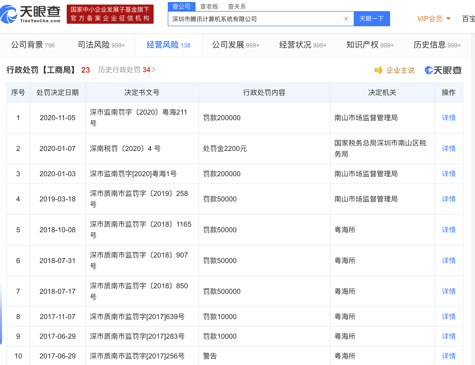 据天眼查APP显示,近日,深圳市腾讯计算机系统有限公司新增1条行政处罚,决定机关为南山市场监督管理局,违法类型为广告违法行为,行政处罚内容为罚款20万元。该公司于1998年11月成立,注册资本为6500万人民币,法定代表人为马化腾,公司经营范围包括计算机软硬件的设计、技术开发、销售;数据库及计算机网络服务;从事广告业务等。