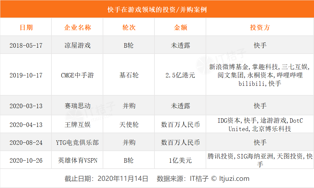 2020 年,快手更是大手笔砸向电竞直播领域,先是在 2020 年 8 月 24 日,快手收购了 YTG 电竞俱乐部,进军王者荣耀职业联赛,推出更多的游戏电竞内容。10 月 26 日快手又参与投资了电竞运营商英雄体育 VSPN 的 B 轮——这家公司当前已经与国内 70% 及海外 50% 顶级电竞运动赛事达成深度合作,累计承办逾万场职业电竞赛事,每年制作播出总时长达 12000 小时的视频内容。