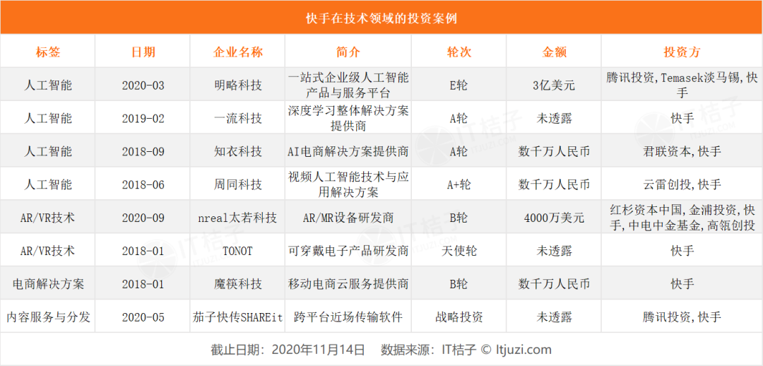 这些企业后来有不少与快手的产生深度合作——如知衣科技,当前知衣科技与多位千万级快手红人合作,促成供应链直播卖货;如明略科技,2020 年在明略科技完成 E 轮融资后表示,将与淡马锡、快手等投资合作伙伴在国际市场拓展、营销智能等方面开展合作;如魔筷科技,在达成投资交易后,2018 年初魔筷正式进入快手平台,为网红的电商交易提供 SaaS 系统。