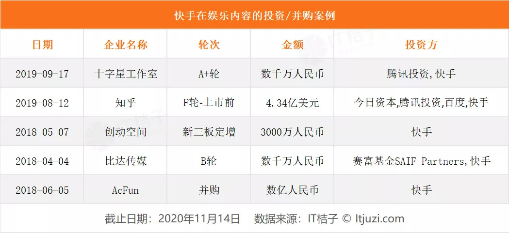 一方面快手围绕主播与直播内容等方面参与了挂牌新三板主要从事的业务为演出服务、演出营销和明星商业活动「创动空间」的定增、投资了提供嘻哈音乐创作服务和艺人经济等业务的「比达传媒」等等;