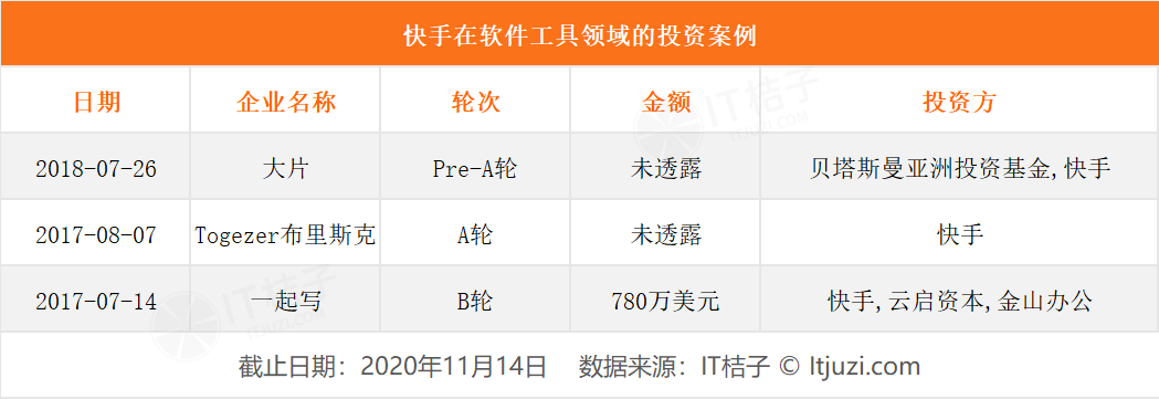 IT 桔子数据显示,2017 年-2018 年快手共计参与了 3 起工具型产品的投资。其最早一起对外公布的投资「一起写」是在快手 2017 年快手 D 轮之后不久。