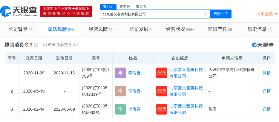 据天眼查APP显示,近日,人人车关联公司北京善义善美科技有限公司新增一则被限制消费令信息,申请人为天津市中昂时代科技有限公司。