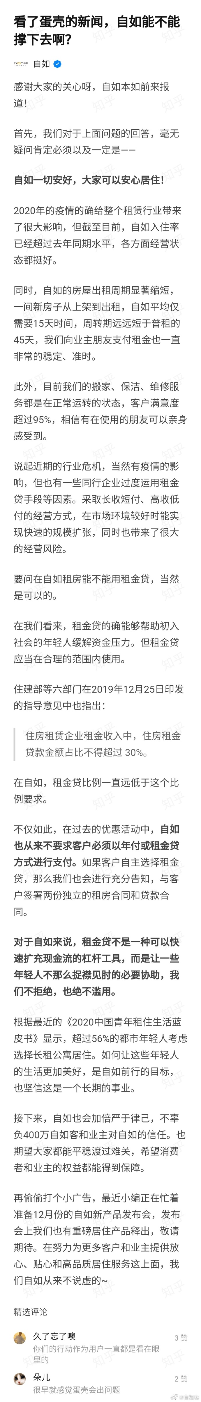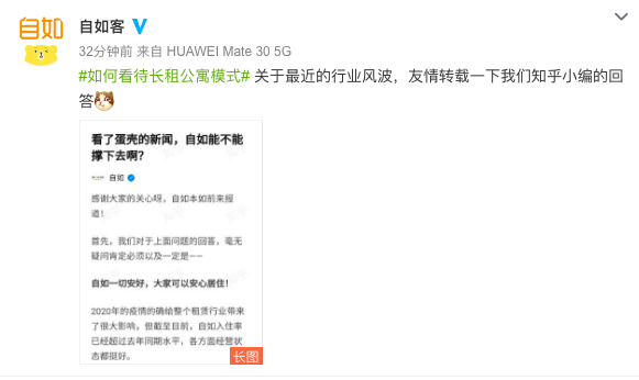 11月17日,网友提问“看了蛋壳的新闻,自如能不能撑下去啊?”,对此,自如发布微博称,自如一切安好,大家可以安心居住!