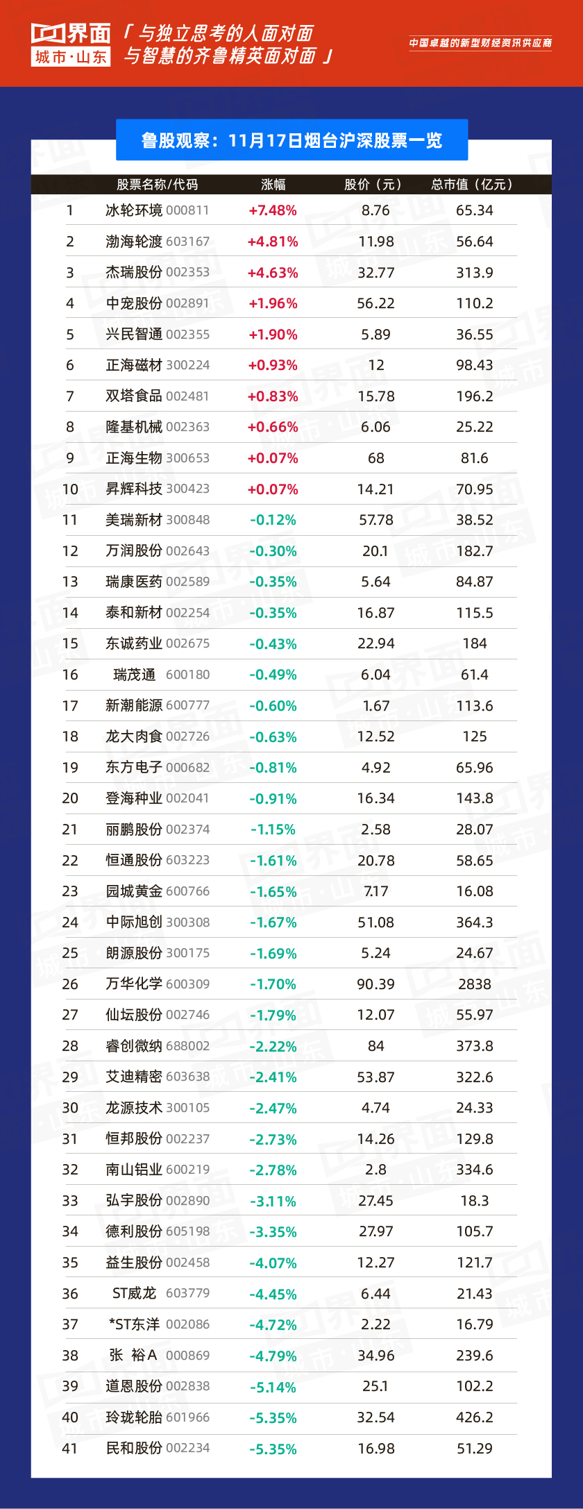 烟台市跌幅榜首:民和股份(002234),涨幅-5.35%,股价16.98元,总市值51.3亿元。