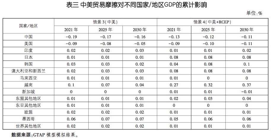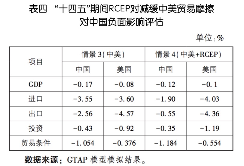 加入RCEP虽不能完全抵消中美贸易摩擦对中国的负面影响,但减缓作用明显。见表四。