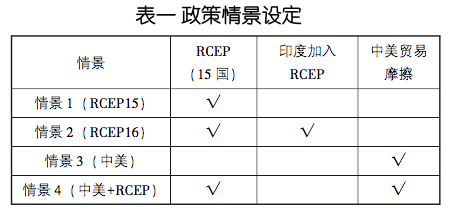 有鉴于此,本文把包含不包含印度也作为其中一个重要影响因素纳入到考量中,并由此设定四种政策情景:一是RCEP协定的影响; 二是有印度加入的RCEP协定的影响;三是中美贸易摩擦的影响;四是中美贸易摩擦下RCEP的影响。