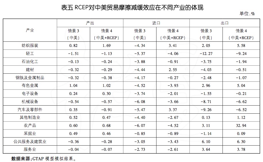 但也要看到,对某些产业而言,加入RCEP没有减缓中美贸易摩擦对国内生产的负面影响,比如,汽车及零部件的国内生产下降0.91%,比情景1减少1.26个百分点。这与加入RCEP后区域产业链整合有关。