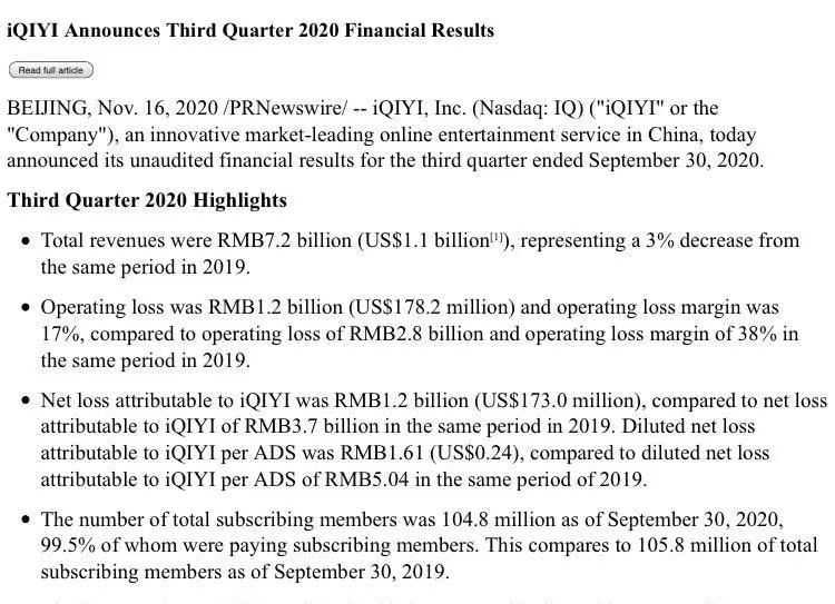 昨天(11月16日)爱奇艺对外公布了2020年Q3的业绩报告。报告显示,爱奇艺Q3总营收达到72亿元(约合11亿美元),同比下降3%;净亏损达到12亿元(约合1.73亿美元),相比之下去年同期净亏损的37亿元,同比大幅收窄。
