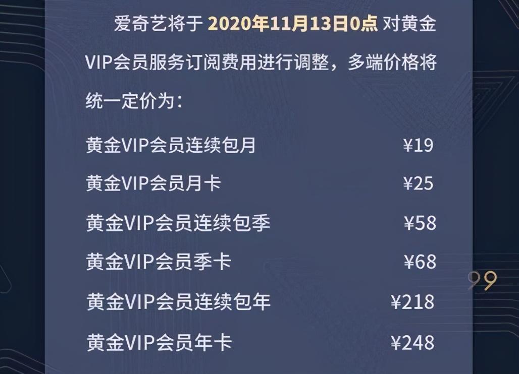 更值得注意的是,这两家平台陆续宣布将进行会员价格上调。爱奇艺将会员调整分为六档,价格从最低19元(连续包月)至最高248元(年卡),月卡价格25元,以此前会员月卡19.8元为参考,此次上调幅度达到25%。