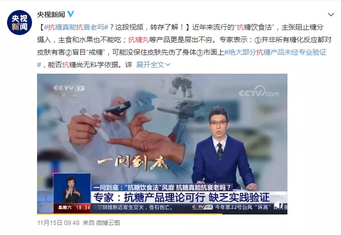 11月15日,微博热搜上突然冒出“抗糖真能抗衰老吗”这个话题,乍一看以为又是哪个商家为了宣传自家的抗糖产品做的营销,结果却是央视对市面上五花八门的抗糖产品发出的灵魂拷问。央视新闻在报道中提到,市面上的抗糖丸、抗糖口服液等抗糖产品理论上可行,但绝大部分产品并未经过系统化专业验证,能否抗糖尚无科学依据。