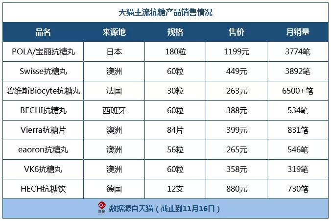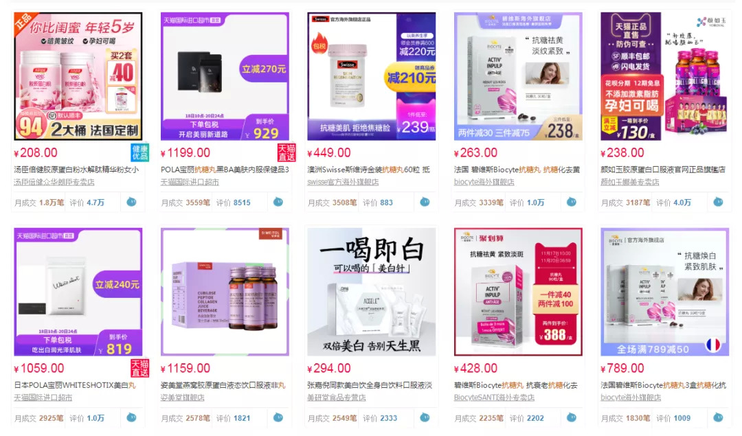 这几年,随着一些明星博主扛起“抗糖化”的大旗,很多消费者也都坚信只要戒糖就能成为“冻龄少女”,在戒不掉甜食、油炸烧烤的前提下,抗糖丸、抗糖液趁势而起成为消费者口袋里的新潮美容小零食。据CBNData发布的《2019口服美容消费趋势报告》显示,2019年主打“抗糖”的进口抗老产品线上消费增速最高,超过抗皱、抗衰老等概念产品。