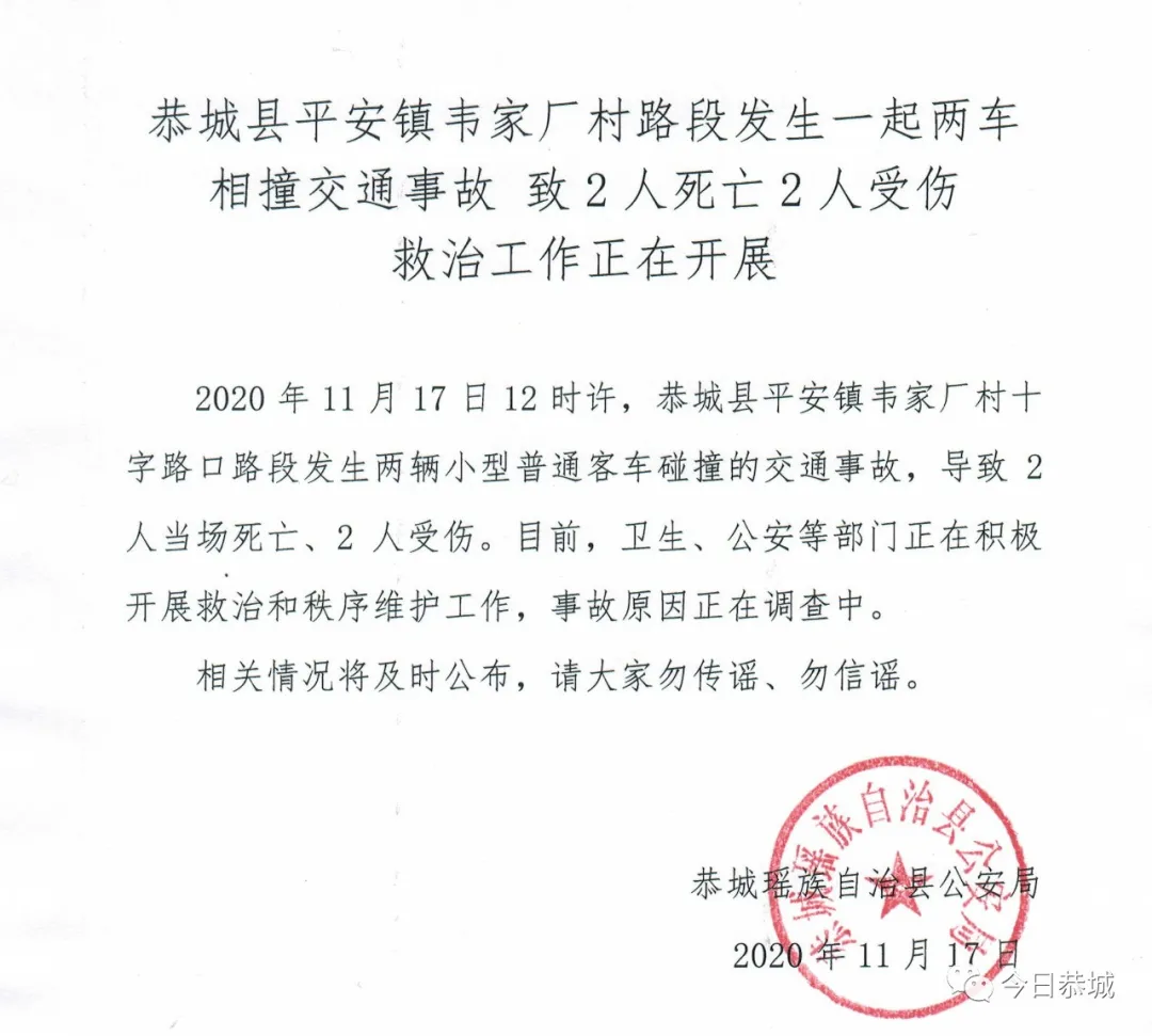 据广西桂林恭城瑶族自治县委宣传部微信公众号通报,11月17日12时许,恭城县平安镇韦家厂村十字路口路段发生两辆小型普通客车碰撞的交通事故,导致2人当场死亡、2人受伤。目前,卫生、公安等部门正在积极开展救治和秩序维护工作,事故原因正在调查中。