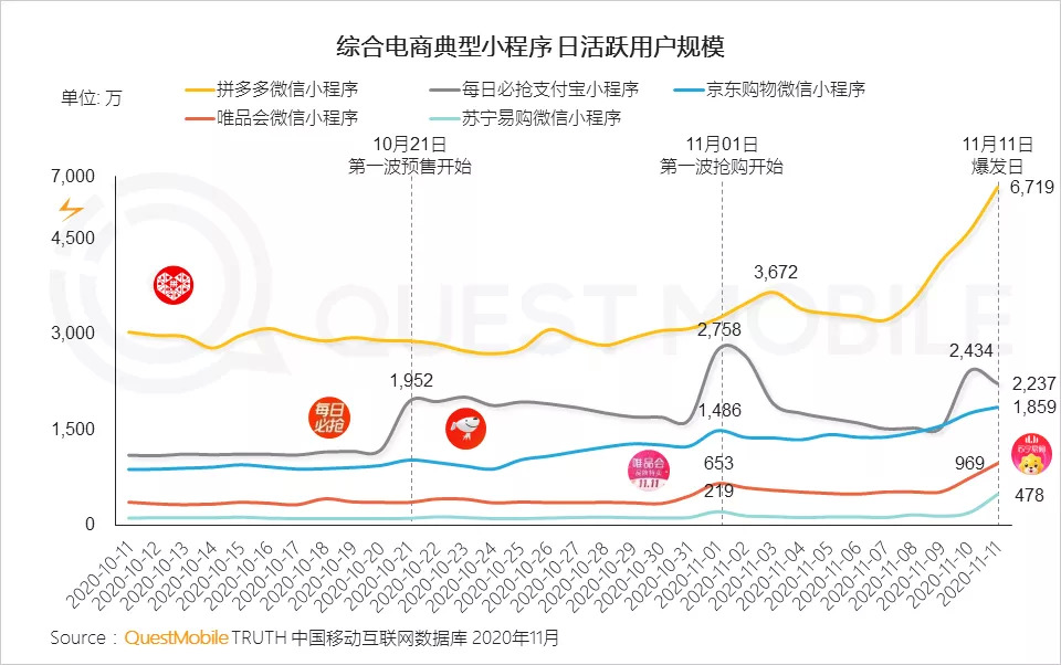3、小程序已成为各大电商平台布局的重要渠道,在双11期间承载着轻购物场景下的社交私域流量用户快速购买转化