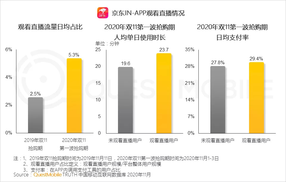 1.2 电商平台直播流量占比提升显著,观看直播用户相比起不观看直播用户在使用粘性及支付率上均明显高于后者