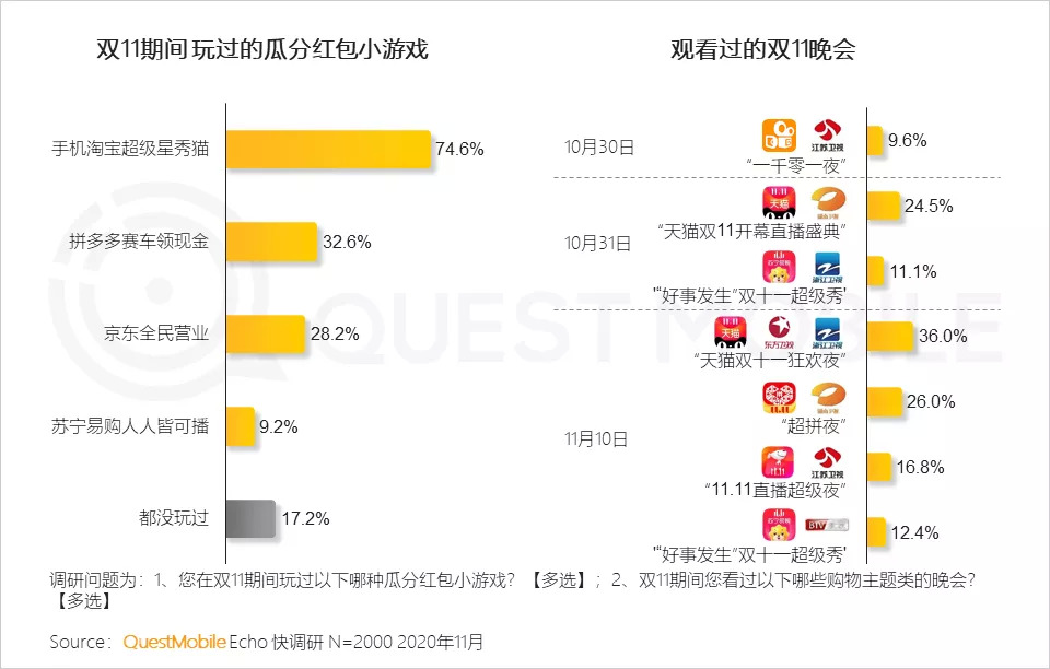 4、养成系游戏已成为各大电商平台通过社交链扩大用户规模、提升用户平台粘性的重要手段;今年双11晚会也带给大众双倍欢乐,各大电商平台与多个播出平台交叉合作