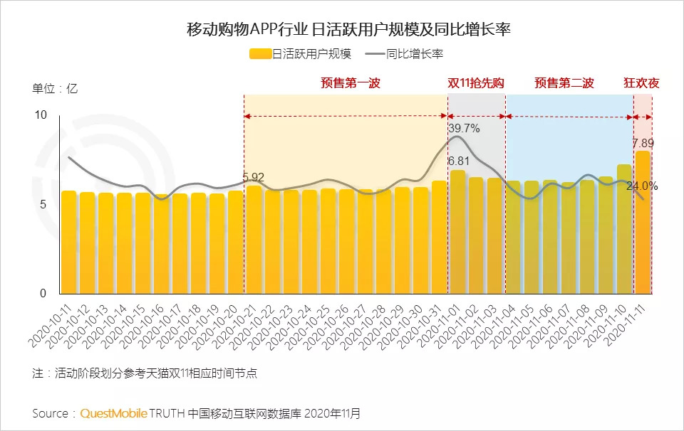 1、从一轮大促升级到两波狂欢,第12年双11能量加码,点燃用户购物热情,移动购物行业迎来用户新高峰,近8亿用户参与线上购物狂欢
