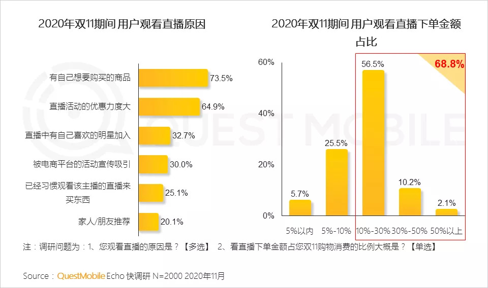 1.3 直播间商品与购物需求的相匹配以及优惠力度大是吸引用户观看直播的主要因素,近七成用户在观看直播下单金额占双11购物消费10%以上