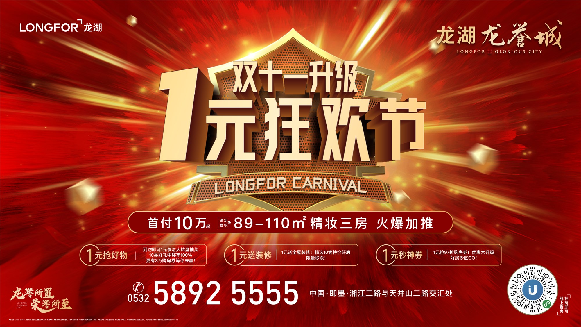 11月16日-30日,龙湖龙誉城“一元狂欢节”疯狂来袭!1元大转盘赢好礼、1元送全屋装修、1元秒杀97折购房券,抢到赚到,与龙湖龙誉城一起FUN肆嗨“购”!