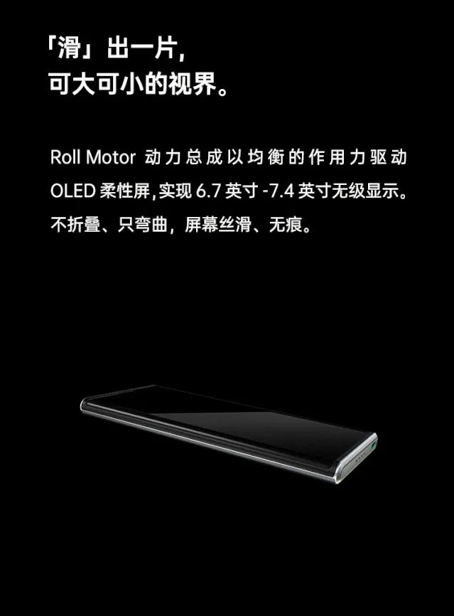 据OPPO介绍,OPPO X 2021卷轴屏概念机搭载最小6.7英寸、最大可达7.4英寸的无级OLED柔性卷轴屏。用户可根据实际需求调整屏幕的尺寸,获得更合适的信息操控界面。