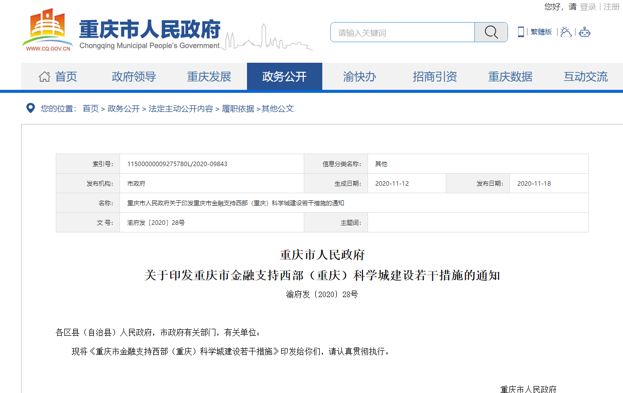 重庆市政府网18日发布《重庆市金融支持西部(重庆)科学城建设若干措施》,从大力集聚创投资本、提升直接融资能力、加强信贷资源配置、引导金融机构聚集、打造金融综合服务平台、加快金融科技发展、完善保障支持体系七大方面,列出20条措施为高起点、高标准建设西部(重庆)科学城,打造成为具有全国影响力的科技创新中心助力。原文如下: