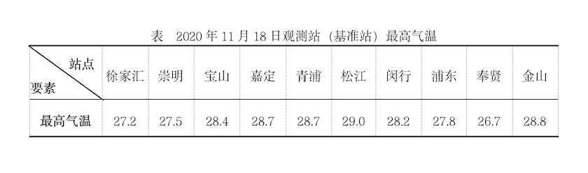 2020年11月18日,上海市白天在暖气团控制下,徐家汇最高气温27.2℃,为1873年以来11月中旬的历史同期第二高位,仅次于1952年11月11日的28.0℃。郊区站,除奉贤以外,均打破建站以来历史同期最高纪录,奉贤站则与历史极值持平。