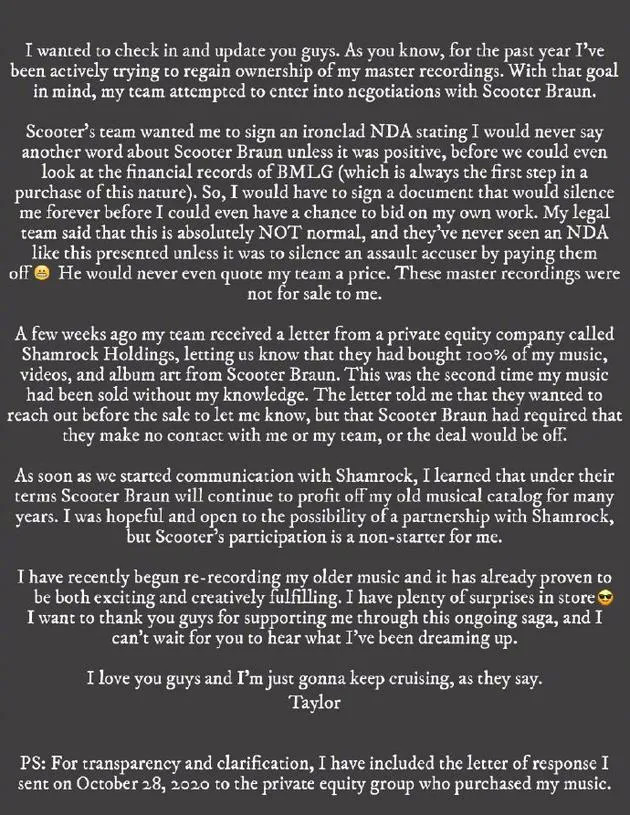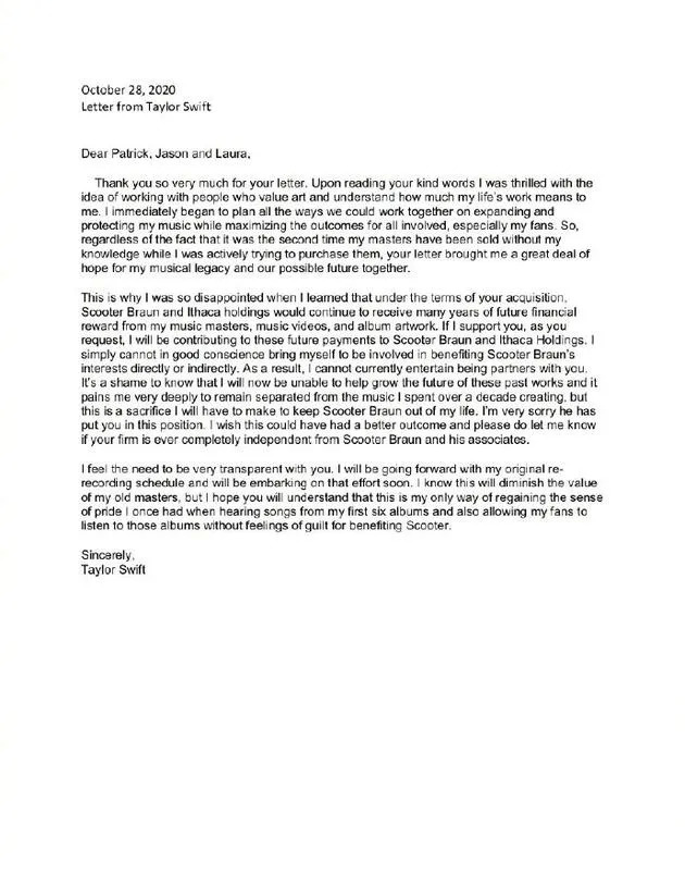 交易完成后,Shamrock于第一时间联系了Taylor Swift。双方本一直在积极探讨开展合作的可能性,直到Taylor发现Scooter Braun能够于此次交易后仍持续从自己的旧专辑中获利。在10月28日发给Shamrock的信件中,她表示:"我们目前无法成为伙伴......让我与十年来创作的音乐保持分离非常痛苦,但这是必须做出的牺牲。"