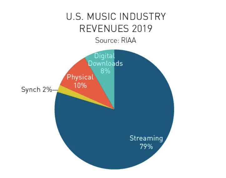 除此之外,虽然Taylor作为创作者可以相当程度地阻止Shamrock从同步许可权中获利,然而根据RIAA发布的统计数据,美国唱片音乐产业2019年总收入达111亿美元,其中同步授权费用仅为2.76亿美元,占比不足2.5%。新买家仍能够从实体音乐销售、数字下载和流媒体等渠道中持续收益。而据RIAA统计,这些收入去年累计占美国音乐产业收入的97.5%。