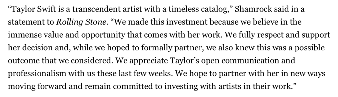 另一方面,雄厚的资本也带来了相当的话语权,而这也将对行业产生巨大的影响力。例如在本次交易中,尽管被要求不得与Taylor产生任何沟通以免影响交易,但Shamrock仍然秉着希望未来能够建立合作的初衷主动联系上这位巨星,颇有诚意地进行了交流,并在一份致《Rolling Stone》的声明中高度赞扬了其所具备的艺术价值:"我们之所以进行这项投资,是因为相信她的作品会带来巨大价值和机遇。我们完全尊重并支持她的决定......感谢她与我们之间保持的透明沟通和专业素养。"并表示将继续寻求与Taylor Swift合作的方式。