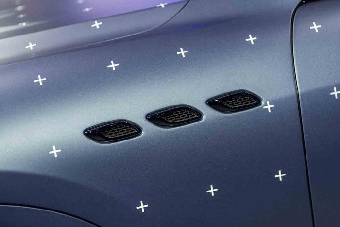FUTURA未来系列在车漆上独树一帜,石墨蓝的车身上点缀着由反光材料勾勒而成的十字坐标点,光照下交互反射光束。内饰上将欧缔兰、防撕裂尼龙织物和超级织物与3D编织技术结合,营造科技感。