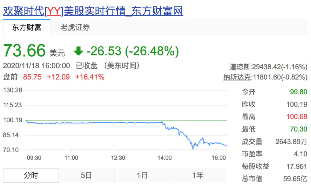 11月17日,百度与欢聚集团同日发布财报,官宣这场联姻:百度将以约36亿美元现金(根据协议或有对价调整)收购欢聚国内视频娱乐直播业务(YY直播),包括但不限于YY移动应用、YY.com网站、YYPC客户端等,预计在2021年上半年完成交易。消息一出,欢聚集团(Nasdaq:YY)股价周二收涨4.82%,报100.19美元。11月17日(周二)美股盘前,欢聚(YY.US)股价大涨,截至20:03,该股涨8.31%,报103.52美元。