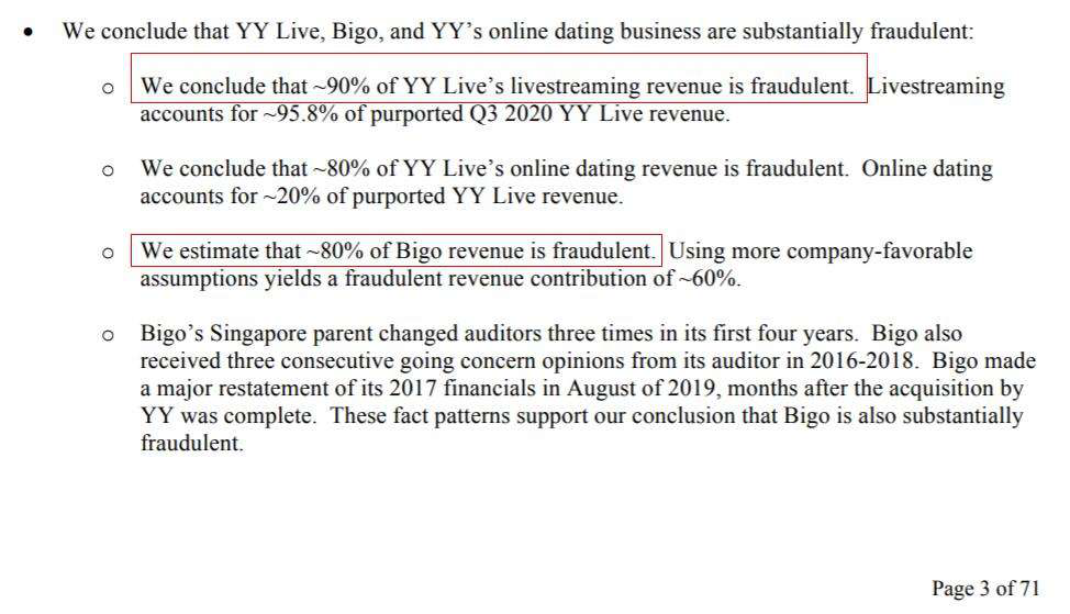 身为美国三大知名做空机构之一的浑水,选择在这个关键时刻,给予百度和欢聚一记又快又狠的重击:11月19日,浑水在社交媒体上发布报告,经过一年多的研究,包括通过自动化收集1.156亿笔交易,进行宏观数据收集和分析,以及审查文件和账目、秘密实地调查等方式,得出欢聚直播业务90%收入为假,海外版Bigo Live 80%收入造假,在线交友收入80%造假,涉及金额达数十亿美元的结论。