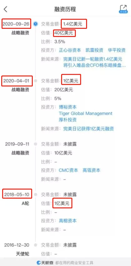 类似完美日记的“奔跑”速度,逸仙电商的资本运作速度也相当惊人。据天眼查显示,在公司成立的4年间,逸仙电商先后共获得过5轮融资。而最近的两次融资分别是在今年的4月和9月,相隔不到半年,两次融资合计2.4亿美元(约合人民币15.71亿元)。由此,逸仙电商的估值也从2018年5月的1亿美元(约合人民币6.54亿元)增至40亿美元(约合人民币261.76亿元)。