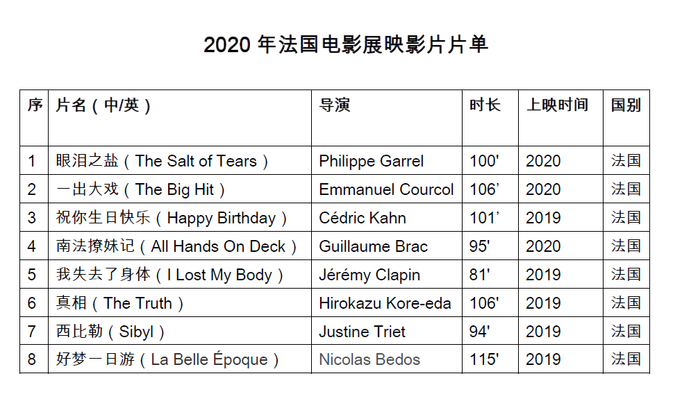2020年法国电影展映影片片单发布,本年度将展映8部法国电影长片,其中包括2020年戛纳电影节入选作品《一出大戏》;入围2020柏林电影节主竞赛的《眼泪之盐》 ;获得2020法国电影恺撒奖最佳动画片的《我失去了身体》 ;入围2019戛纳电影节主竞赛单元的女性题材作品《西比勒》 等。