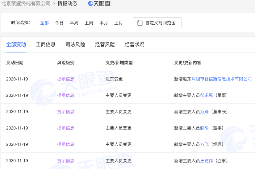 据天眼查APP显示,11月19日,北京荣耀终端有限公司发生主要人员变更,华为消费者业务COO万飚出任董事长,赵明、彭求恩出任董事,方飞任经理,王述伟任监事。同时,新增股东深圳市智信新信息技术有限公司,持股比例100%。