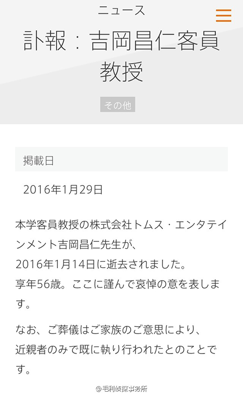 根据日本媒体报道,日本长篇动画《名侦探柯南》制作人、日本数字好莱坞大学客座教授吉冈昌仁,于2016年1月14日因病离世,享年56岁。根据其家人要求,葬礼仅亲属参加。