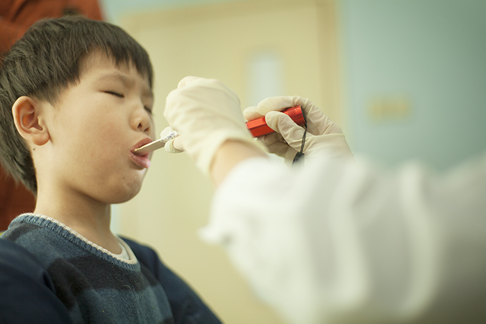 一个发烧的男孩看到医生拿出的压舌板,咧嘴欲哭,脸蛋涨得越发通红,一把抓过彭博手上的压舌板扔到一旁。