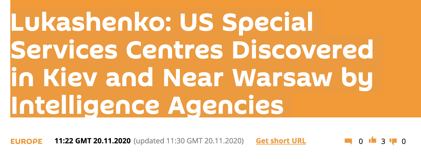 俄罗斯卫星通讯社11月20日消息,白俄罗斯总统卢卡申科周五表示,俄罗斯和白俄罗斯情报机构在基辅和华沙附近发现了对明斯克怀有敌意的美国特别服务中心。