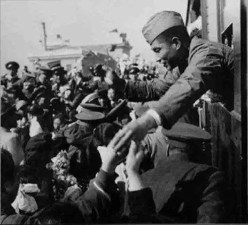 1958年10月,最后一批志愿军官兵回国。图为戴55式船形帽的志愿军士兵向欢送人群告别。