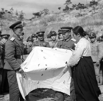 1958年志愿军归国前曾驻守上甘岭的部队向朝鲜人民告别。图中志愿军官兵身着55式军服。