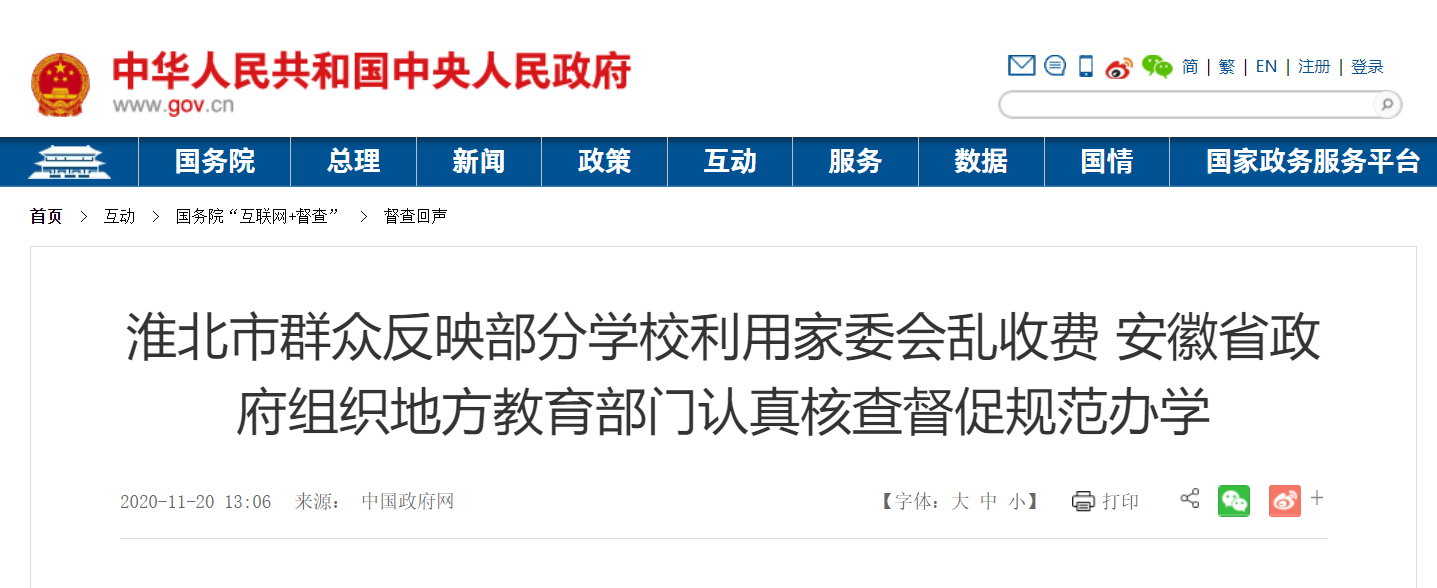 据中国政府网消息,淮北市王先生2020年9月6日通过国务院“互联网+督查”平台反映,有的中小学校利用家委会名义要求学生到老师指定的书店购买学习资料、参加指定的校外辅导班。