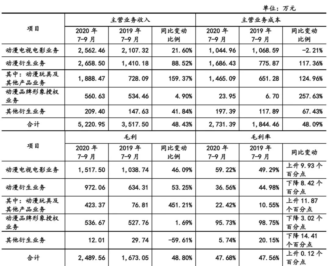 第三季度,来自动漫电视电影业务的收入同比2019年增加21.6%至2562.46万元,来自动漫衍生业务的收入也同比实现了上涨——收入972.06万元,同比增长53.25%。