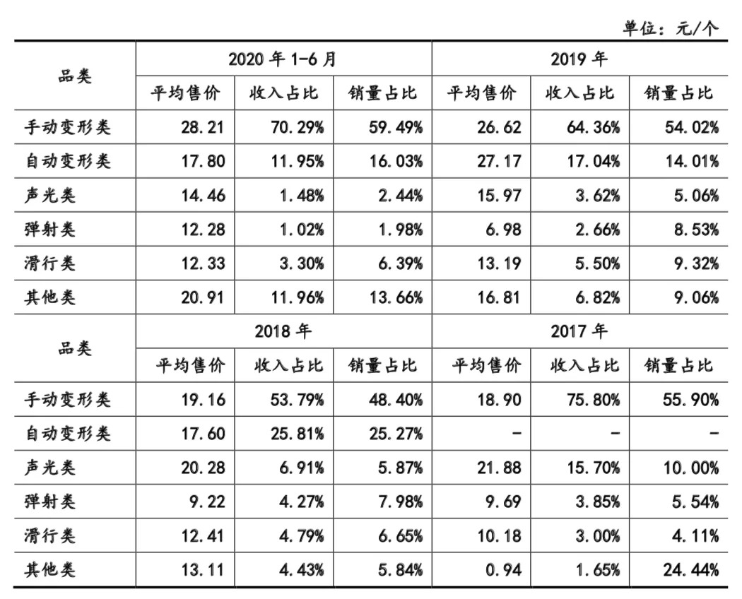 也是主要得益于这一系列玩具的销售,2020年上半年漫玩具及其他产品业务销售收入达到了2995.88万元,占公司当期主营业务收入的51.84%。从推出的主要玩具品类看,主要包括手动变形类、自动变形类、滑行类、声光类、弹射类、其他类。