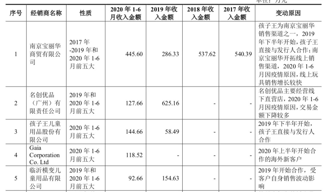 主要OEM供应商为中山市三乡镇鸿艺塑料制品厂、中山市星烁五金塑胶有限公司、汕头市澄海锦江玩具实业有限公司以及汕头市恩立科教玩具有限公司,四家合计的采购额占当期动漫玩具采购额的比例分别为96.71%、96.67%、96.03%以及94.59%。