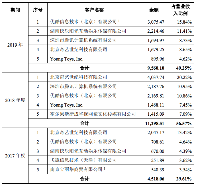 优酷2017-2019年分别给咏声动漫贡献收入708.61万、2169.81万、3075.47万元;爱奇艺2017-2019年则分别给咏声动漫贡献收入2047.17万、4037.74万、1679.25万元;腾讯2018-2019年分别贡献2187.76万元,1694.97万元。