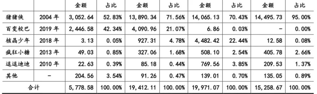 从收入金额角度,2017-2019年及2020年上半年,“猪猪侠”IP为咏声动漫贡献收入金额分别为14495.73万元、14065.13万元、13890.34万元和3052.64万元,占当年收入的比重分别为 95.00%、70.43%、71.56%和52.83%,为公司收入贡献最大的IP。