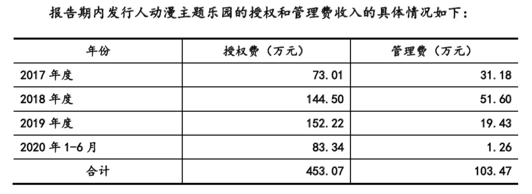 2017-2019年和2020年上半年,咏声动漫来自动漫主题乐园的授权费分别为73万元、144.5万元、152.22万元,以及83.34万元。共计453.07万元。同期的管理费收入分别为31.18万元、51.6万元、19.43万元,以及1.26万元。共计103.47万元。